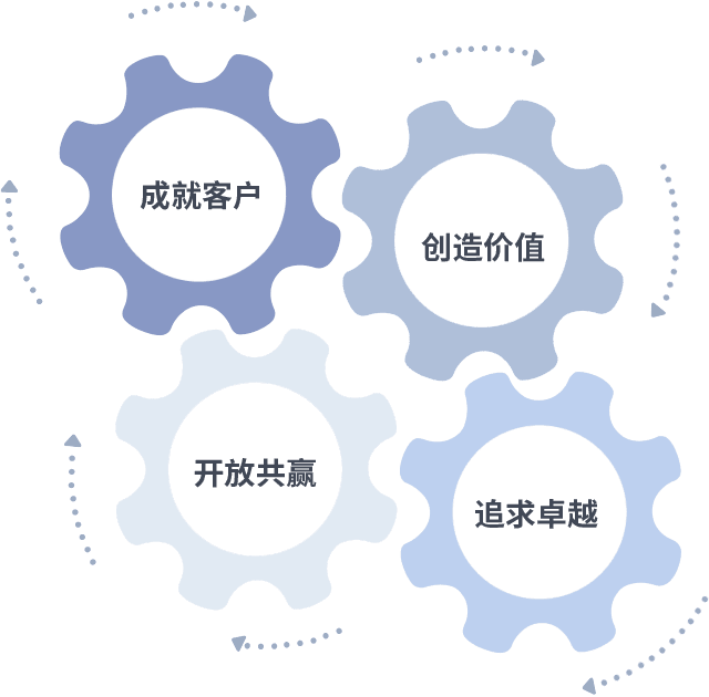 成就客户是一切决策的出发点,,创造价值是衡量所有工作的标准,,追求卓越是我们做事做人的态度,,开放共赢是我们的格局也是最终的结果。。。。价值观的齿轮环环相扣,,,推动着组织里的每个人不断向前。。