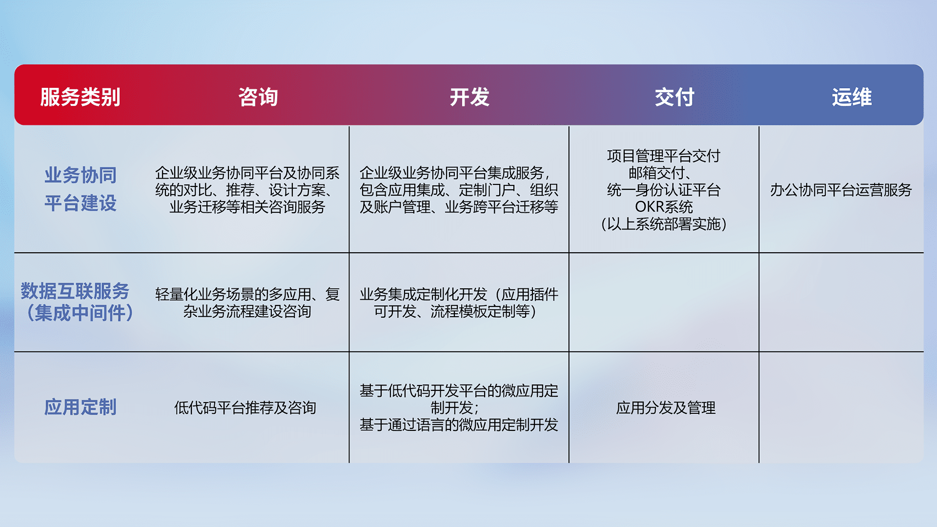 针对钉钉、、企微、、IDaas等平台级产品提供产品的规划、、、、方案、、、、交付、、、、定制化开发等服务,,,实现如统一协同办公、、、、智能客户服务、、混合会议管理、、智能数据查询、、等业务场景,,实现数字化转型。。